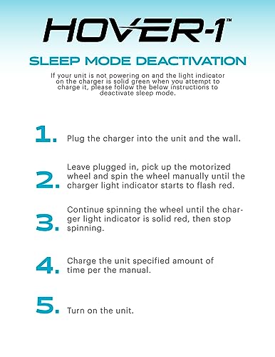 - SLEEP MODE DEACTIVATION - Plug the charger into the unit. Pick up motorized wheel while plugged in and turn the wheel manually until the charger brick light starts to flash red continue until charging light indicator is solid red, then stop turning. Charge unit until specified amount of time per the manual