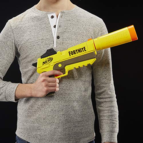 Details: The Nerf Fortnite SP-L blaster is inspired by the blaster used in Fortnite, replicating the look and colors of the one from the popular video game! Play Fortnite in real life with this Nerf Elite blaster that has a detachable barrel to customize for different ways to play. Attach the barrel for distance targeting; remove the barrel when you need a more compact look for smaller play areas or when you need to move fast and stay mobile. The Fortnite sp-l blaster has an internal clip with a 3-dart capacity, so you can load 3 darts in a row before it's time to reload. Insert 3 darts, Prime, and pull the trigger to fire. It comes with 6 official Nerf darts that are designed for distance, tested and approved for performance and quality, and constructed of foam with flexible, hollow tips. Drop into indoor and outdoor Fortnite action with this dart-firing Nerf elite Fortnite blaster! Hand-powered -- no batteries needed. Copyright epic games. 2019 Hasbro. All Rights Reserved. 2019, Epic games, Epic, epic games, The epic games logo, fortunate, the Fortnite logo, unreal, unreal engine 4 and Ue4 are trademarks or registered trademarks of epic games, In the USA and elsewhere. All Rights Reserved. ".
