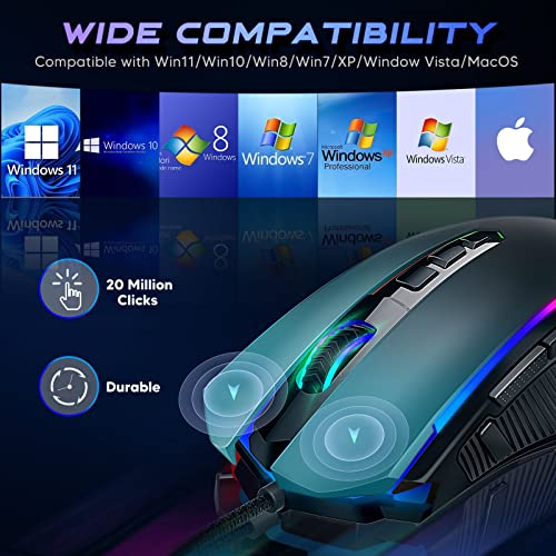 - 【CUSTOMIZE GAMING ATMOSPHERE】The gaming mouse with 5 RGB backlit modes, you can adjust the color and brightness, and also turn off or change a single color, to create a cool atmosphere for gaming.