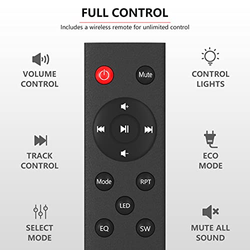 Details: Specification: Drives Size: 4" Subwoofer /2.5" Satellite Speakers Output Power : 21W (15W + 3W x 2) Power Input: AC 110V Frequency Response : 30Hz-20KHz Impedance: 6 ohm (Subwoofer)/4 ohm (Speakers) Input Modes: Bluetooth, AUX , FM Radio,USB, SD Subwoofer Dimensions : 8.3 x 6 x 9.5 inches Satellite Speakers Dimensions : 3 x3.9 x 6.9 inches. Full Function Remote Our 2.1-Channel Home Theater Speaker System equipped with a full-function wireless remote control,convenient for you to remotely control the speaker. Remote functions include (Power on/off,Mute , volume adjustment, Play/pause , Prev song, Next song, USB/SD/Bluetooth/AUX input/FM radio mode switch,Cycle button, Sound effect switch.)