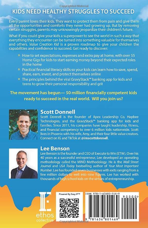 Details: Kids Need Healthy Struggles to Succeed Every parent loves their kids. They want to protect them from pain and give them all the opportunities and comforts they never had growing up. But by removing certain struggles, parents may unknowingly jeopardize their children’s future. What if you could give your kids a superpower to ensure their success outside the home? A lens to see the world in such a way that everything they encounter can be turned into something valuable for themselves and others. A true antidote that protects your kids against becoming victims, spoiled, anxious, fearful, lazy, or entitled. Value Creation Kid is a proven roadmap to give your children the capabilities and confidence to succeed. Get ready to discover: The recipe to create a fun, value-creation learning environment at home How to turn healthy struggle into capability, confidence and value creation How to shut down the Bank of Mom and Dad for good How to set expectations, expenses and extra pay at home, with over 55 Home Gigs for kids to start earning money beyond their expected roles in the home Practical financial literacy skills so your kids can learn how to save, spend, share, earn, invest, and protect themselves online The principles behind the viral GravyStack™ banking app for kids and teens to grow their personal responsibility and grit The movement has begun— 50 million financially competent kids ready to succeed in the real world. Will you join us?